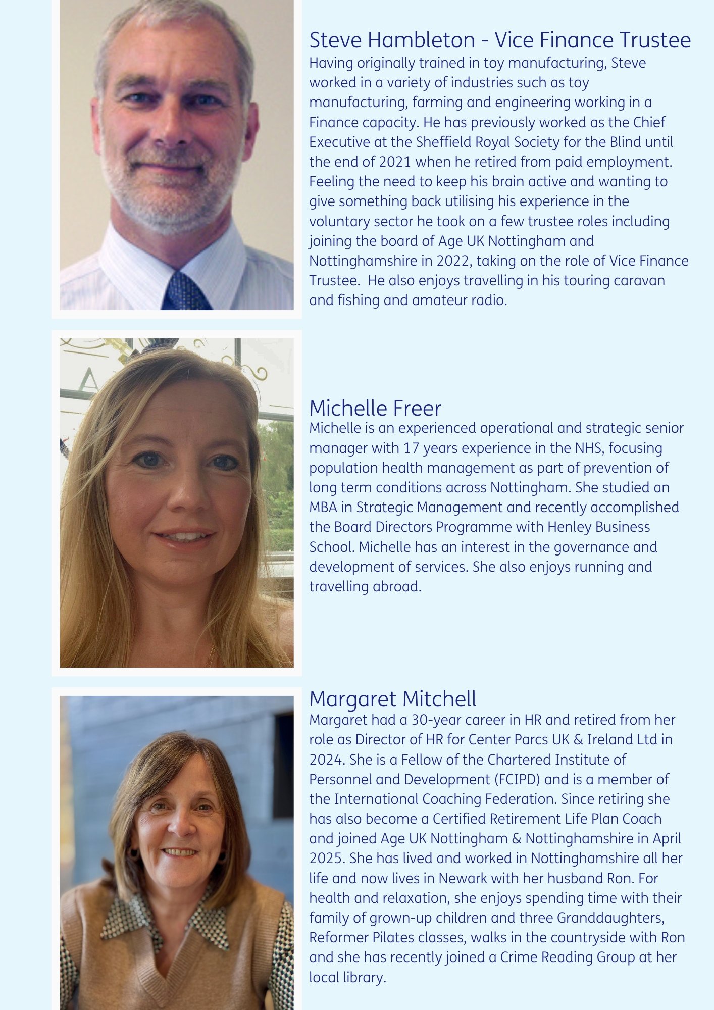 The Age UK Notts Community Advisory Panel acts as a consultation group and the ‘bridge’ between our charity and the wider community. They support the charity by raising issues from the community, reviewing our services and acting as ambassadors for the charity to ensure people can find the help they need as quickly as possible.
