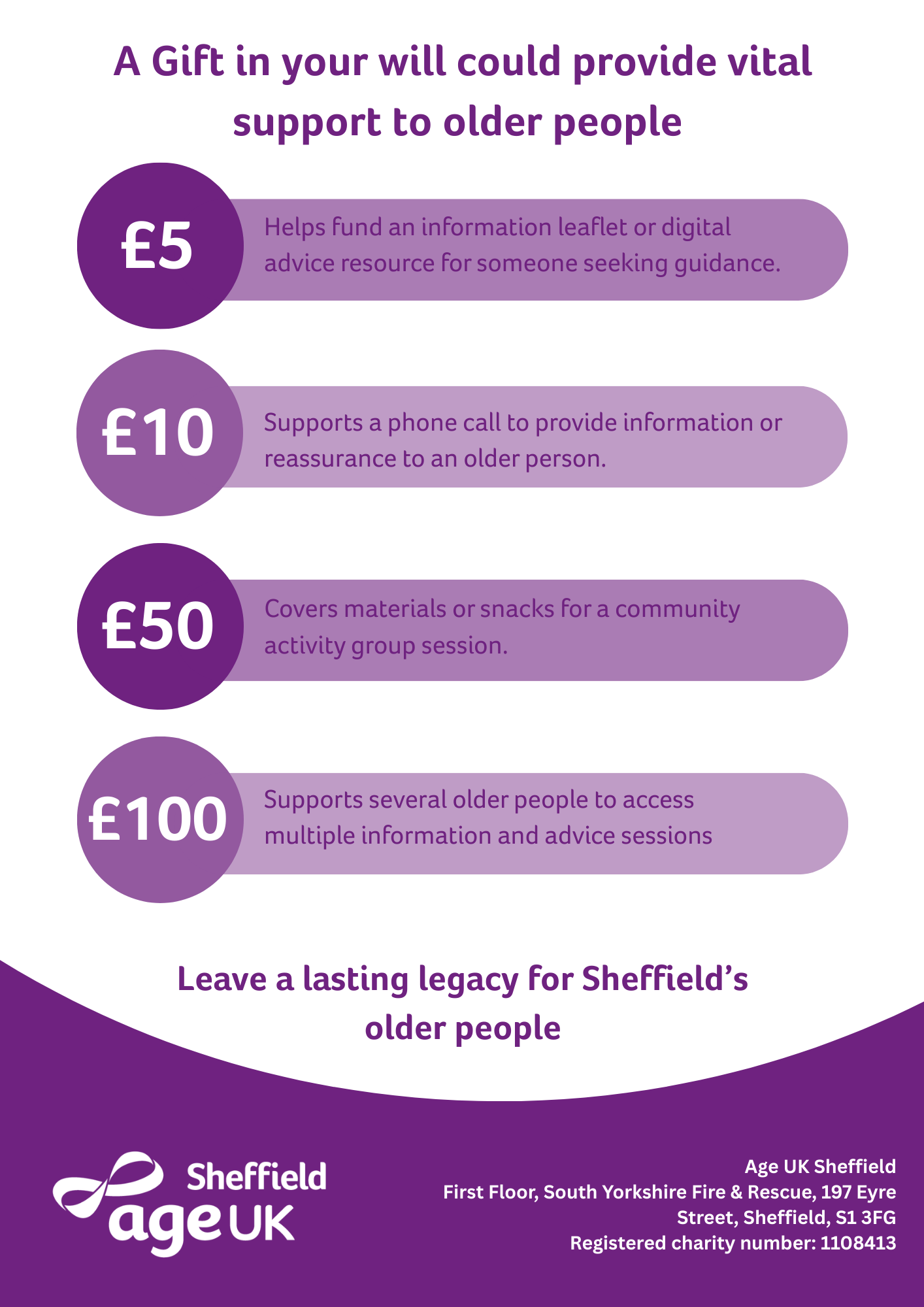 Every single gift is vital to Age UK Sheffield and we appreciate any gift you may choose to leave us after taking care of your family and friends. Whatever the value of your gift, it will go a long way to help someone who needs us.