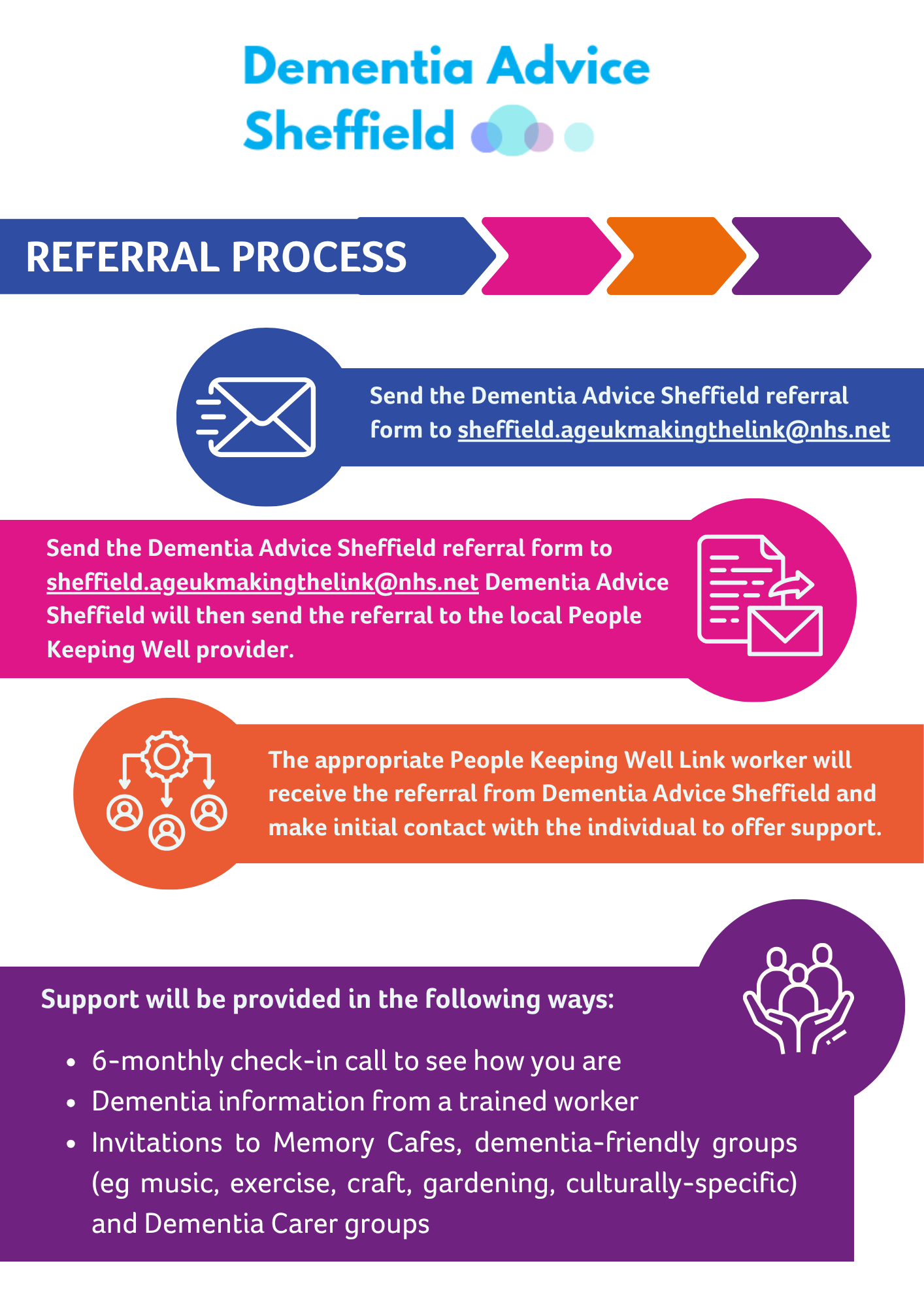 If you'd like to access free training, talk about a work situation you're dealing with, or refer someone you are supporting to a local dementia-friendly activity in their neighbourhood, it's easy for any professional or volunteer to contact Dementia Advice Sheffield.