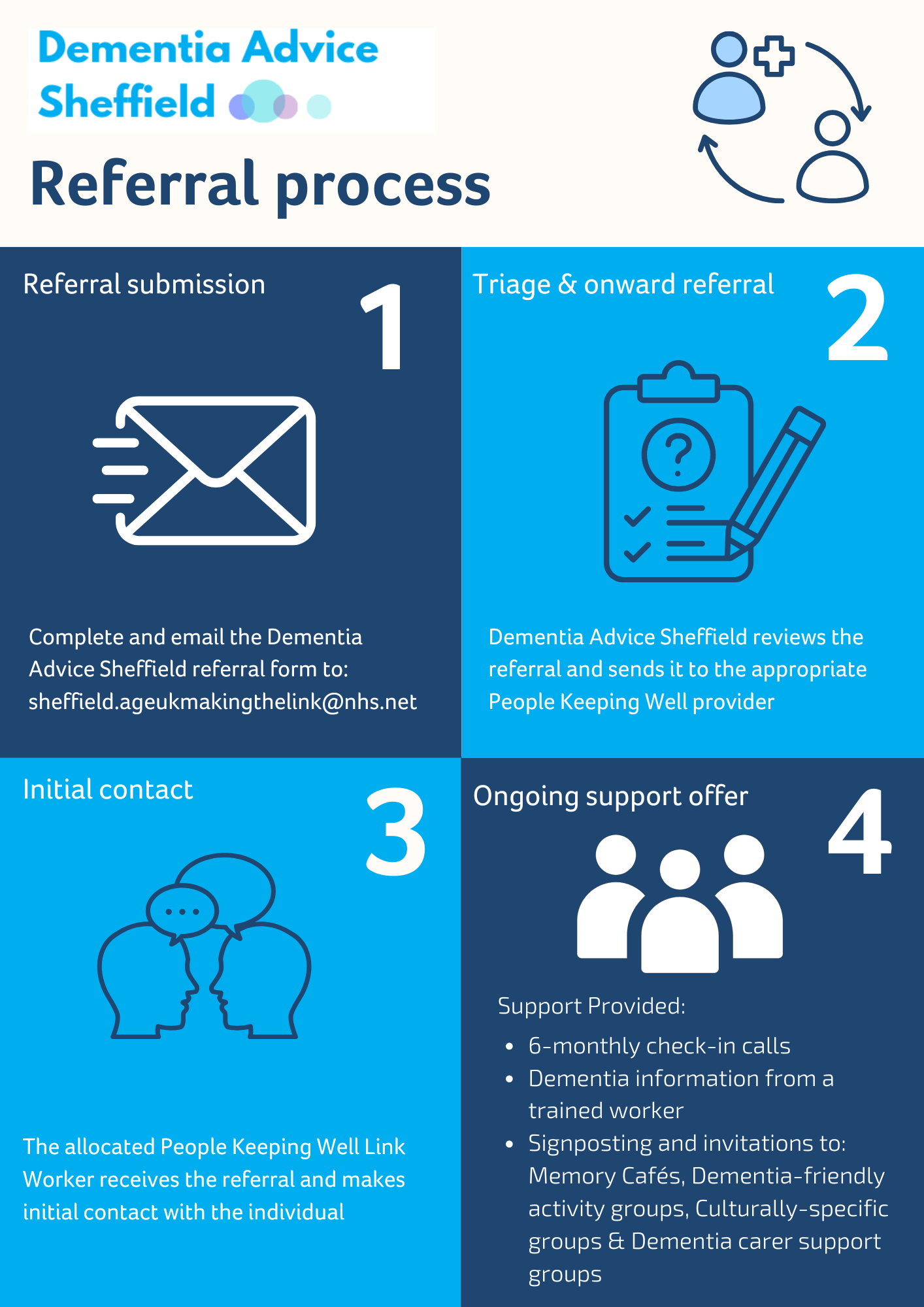 To refer someone who is living with dementia to Dementia Advise Sheffield complete this referral form and send to Sheffield.ageukmakingthelink@nhs.net Please see referral process below