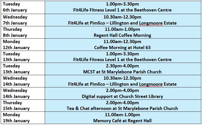 Heart of Westminster Memory Café Monday 11.00am-1.00pm – Takes place every 3rd Monday of the month at Regent Hall, Welcome Hub, 275 Oxford Street, W1C 2DJ, near Oxford Circus Tube Station.