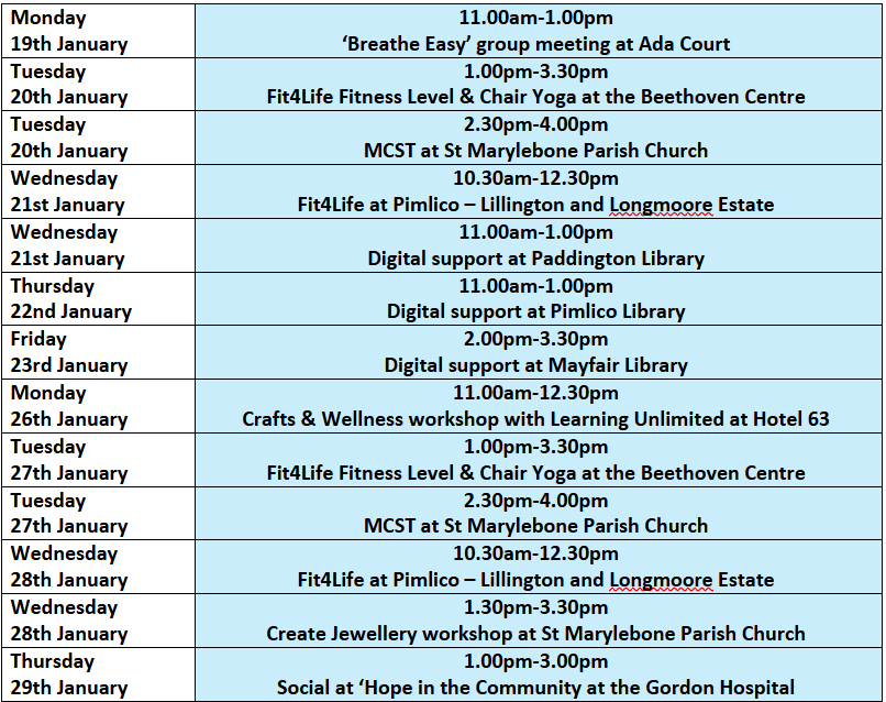 Thursday 29th January 1.00pm-3.00pm Social Group coffee afternoon - Hope in the Community held monthly at the Gordon Hospital, Bloomburg Street, London, SW1V 2RH