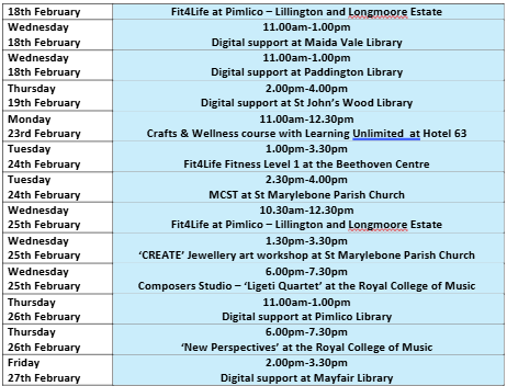 Our weekly Creative Dance & Movement sessions take place on Monday 2nd, 9th, 16th & 23rd February, 2.00pm – 3.30pm at Penfold Community Hub, 60 Penfold Street, NW8 8PJ. Gentle and playful movement class; chair based. For more information, please call Katie on
