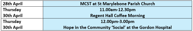 Thursday 30th April 1.00pm-3.00pm Social Group coffee afternoon - Hope in the Community held monthly at the Gordon Hospital, Bloomburg Street, London, SW1V 2RH