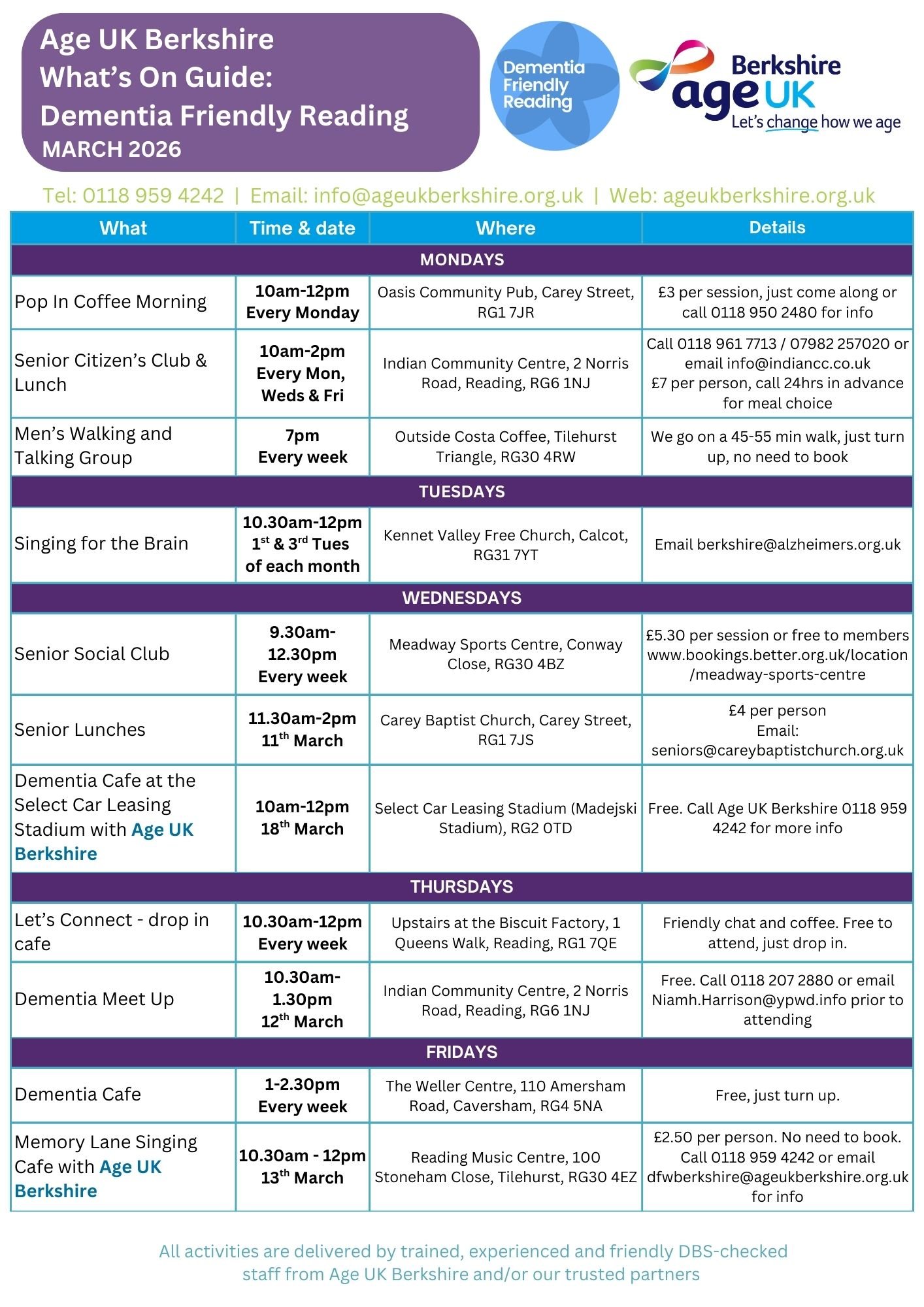 Looking for things to do in the Reading area? Take a look at our What's On Calendar - all events are dementia friendly and welcoming to all.