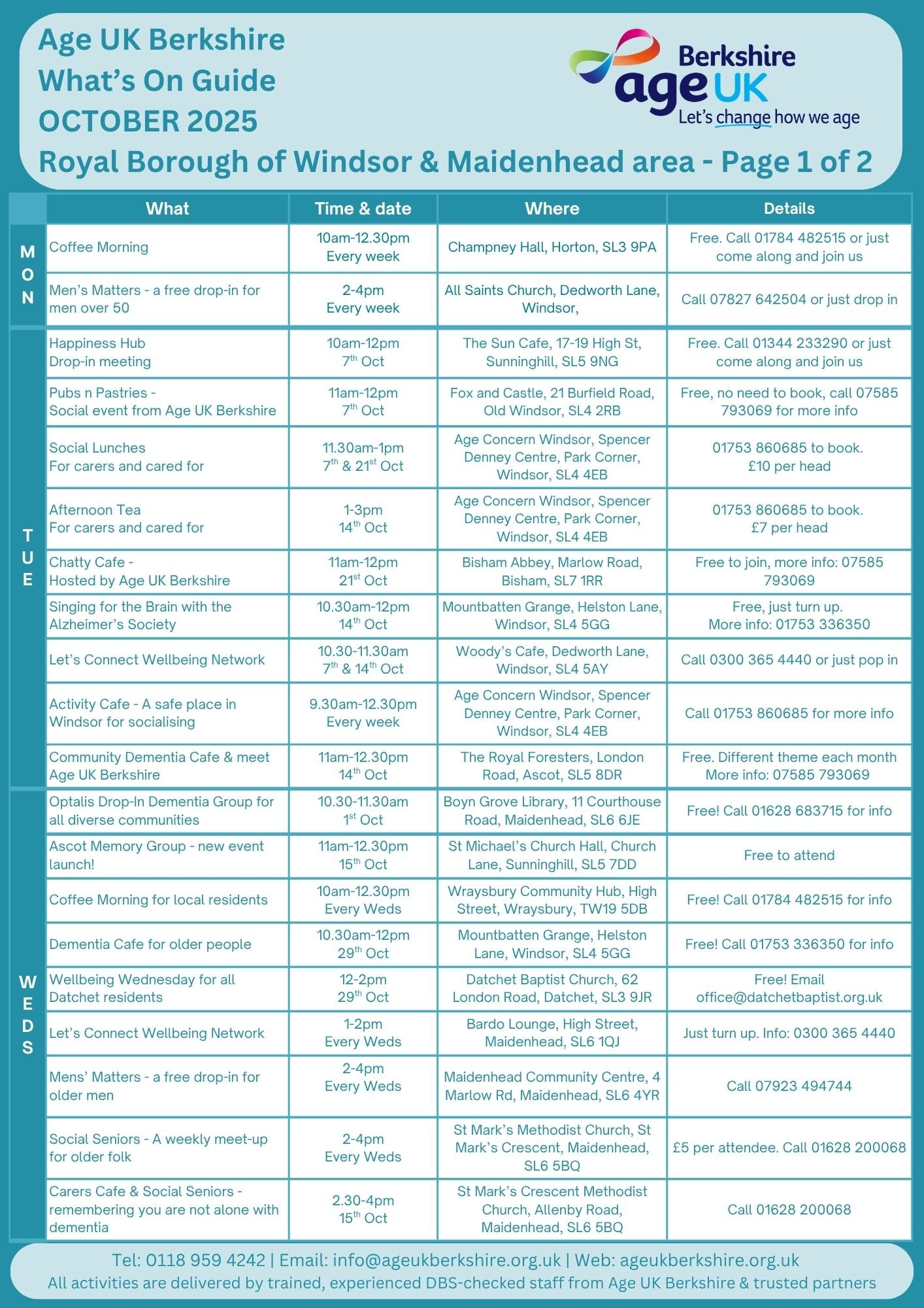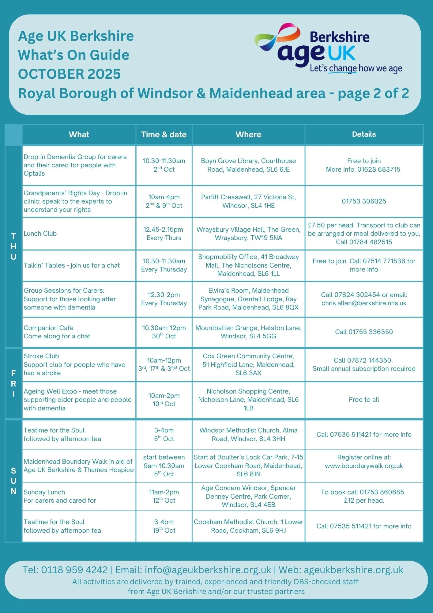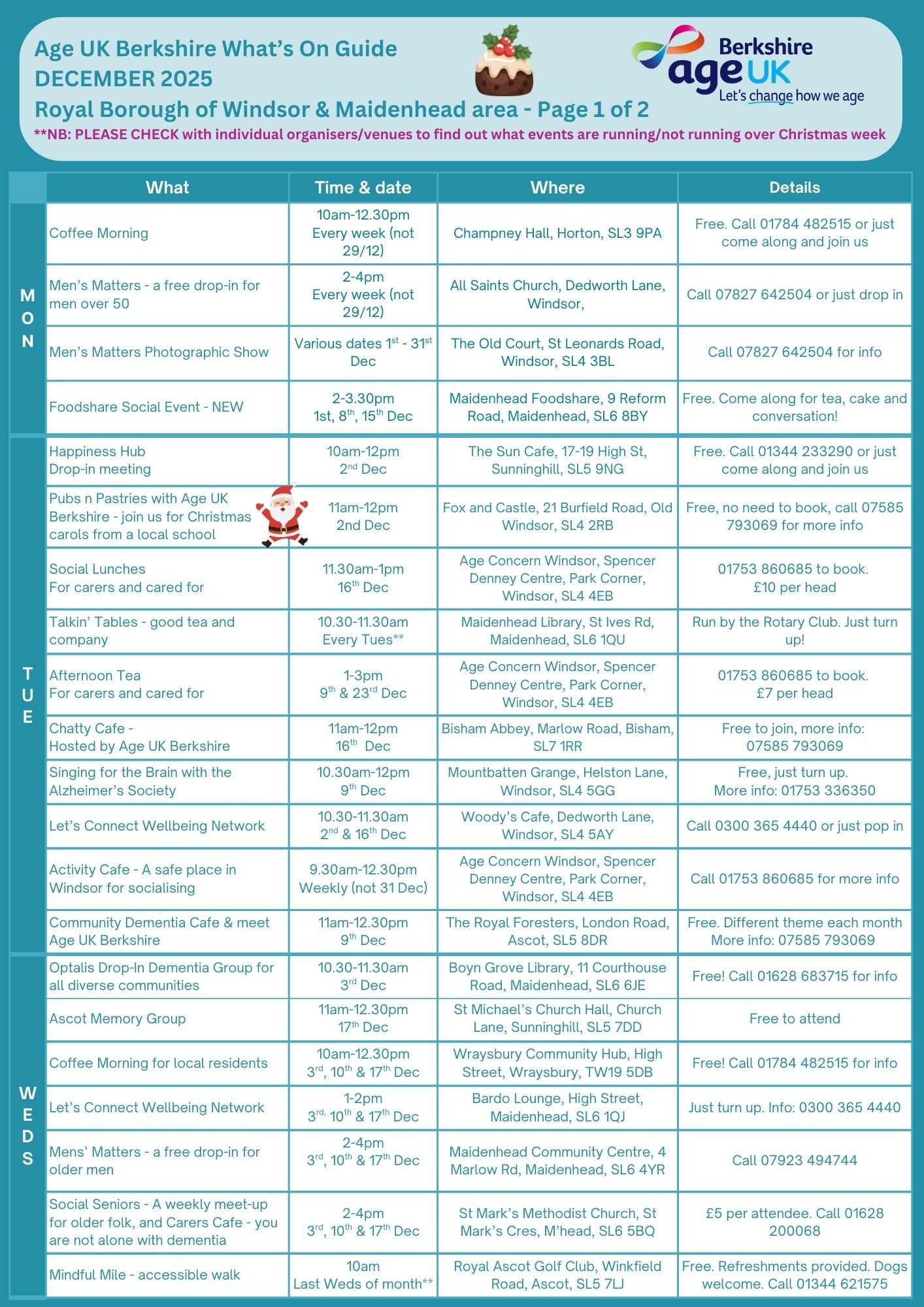 We have lots of activities and events for older people in Windsor and Maidehead. All our services are delivered by trained and experienced DBS-checked staff from Age UK Berkshire or our trusted partners.