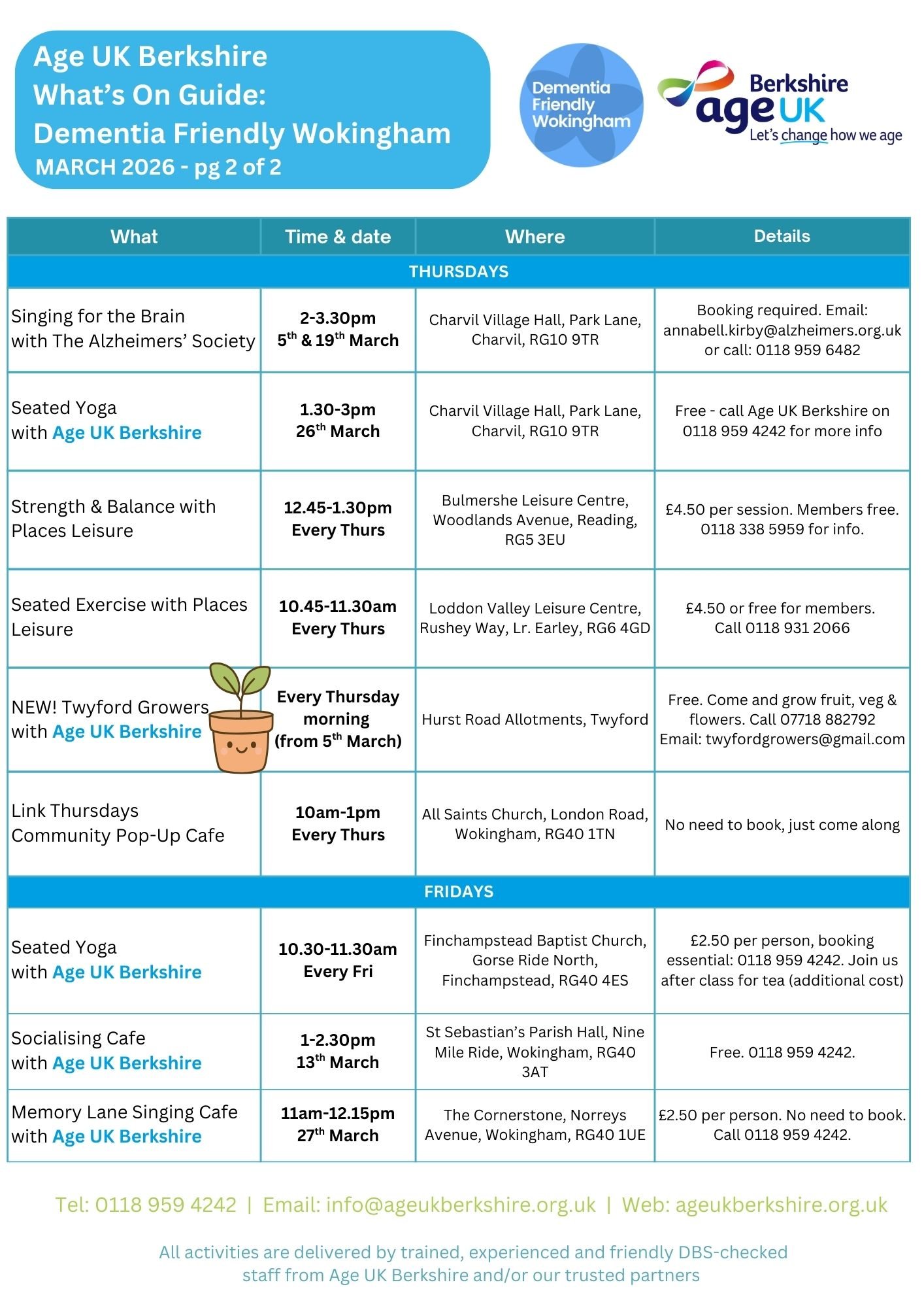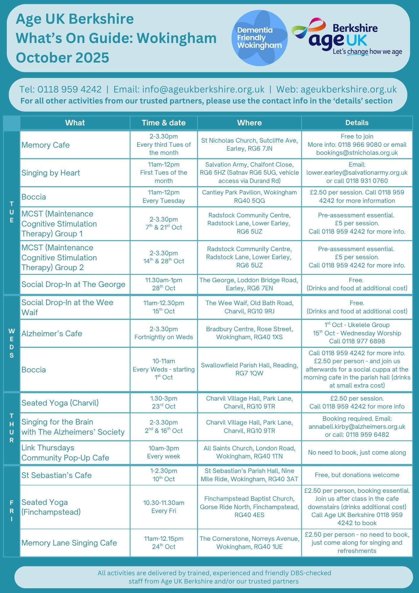 We have lots of activities for older people happening in the Wokingham area, delivered by Age UK Berkshire and / or our trusted partners. All activities are delivered by trained, experienced and DBS-checked staff.