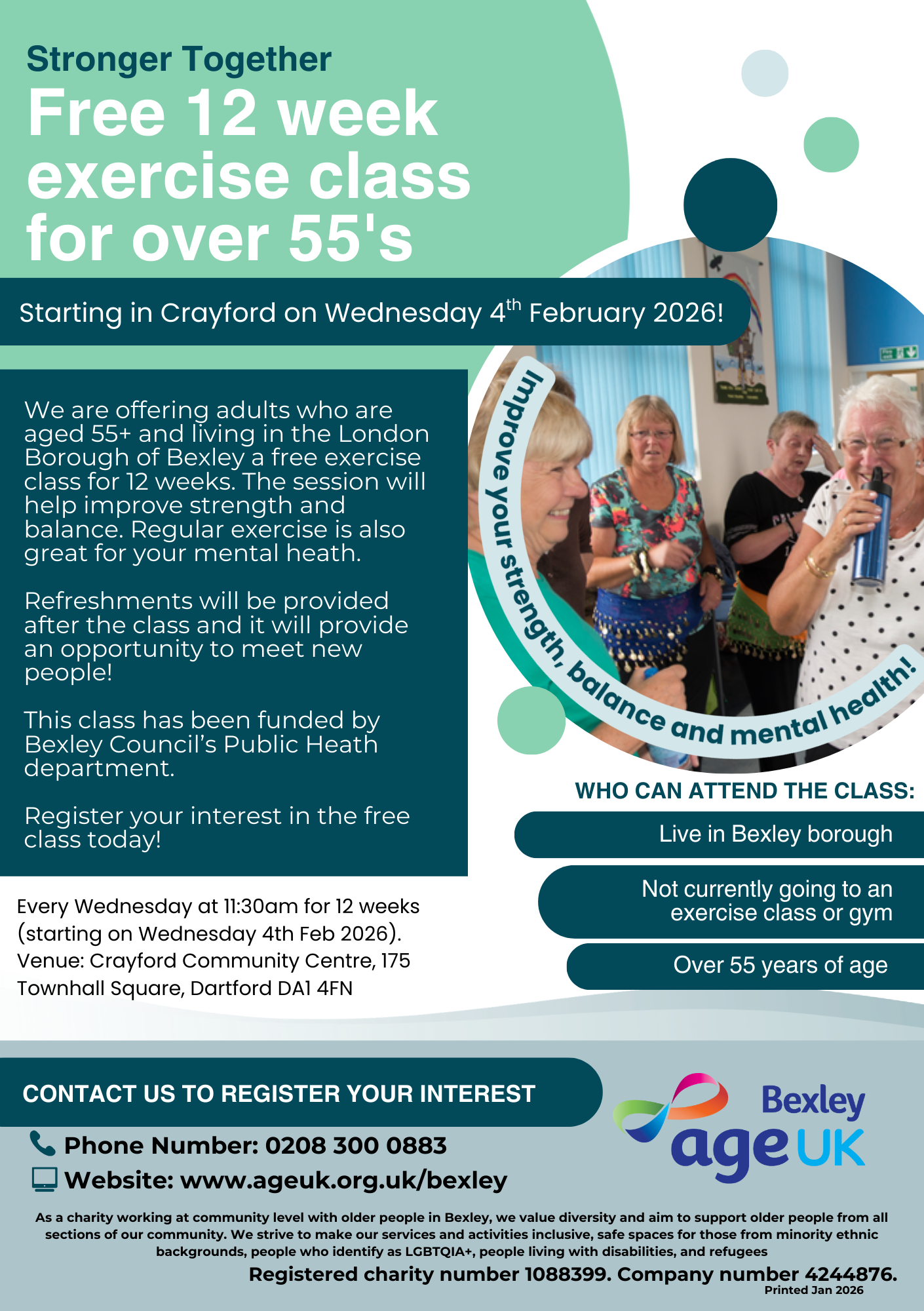 Stronger Together is a 12-week free exercise class for adults aged 55+ who are not currently undertaking any other regular fitness activities. It is funded by the Public Health Department at the London Borough of Bexley. The aim of the programme is to maintain health and fitness and prevent frailty and falls which can significantly impact quality of life. The programme also offers the opportunity to meet other people over a cup of tea or coffee and supports people to access other services that may be relevant to their needs. Participants will undertake an assessment at the beginning and the end of the 12 week programme in order to track improvements.