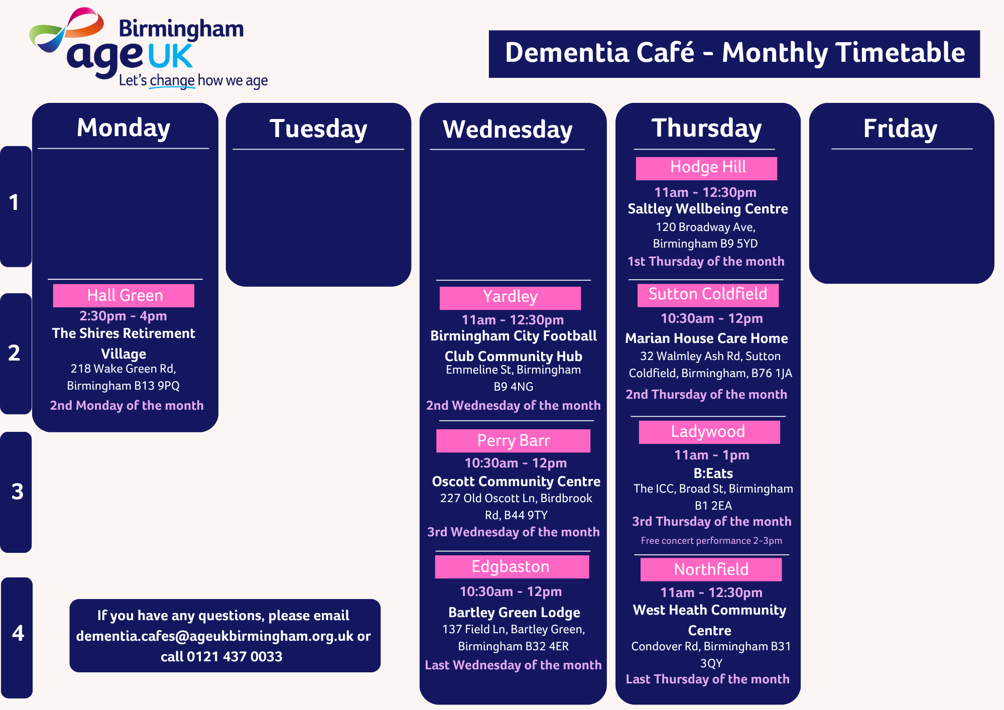 For more information, please contact dementia.cafes@ageukbirmingham.org.uk or call 0121 437 0033