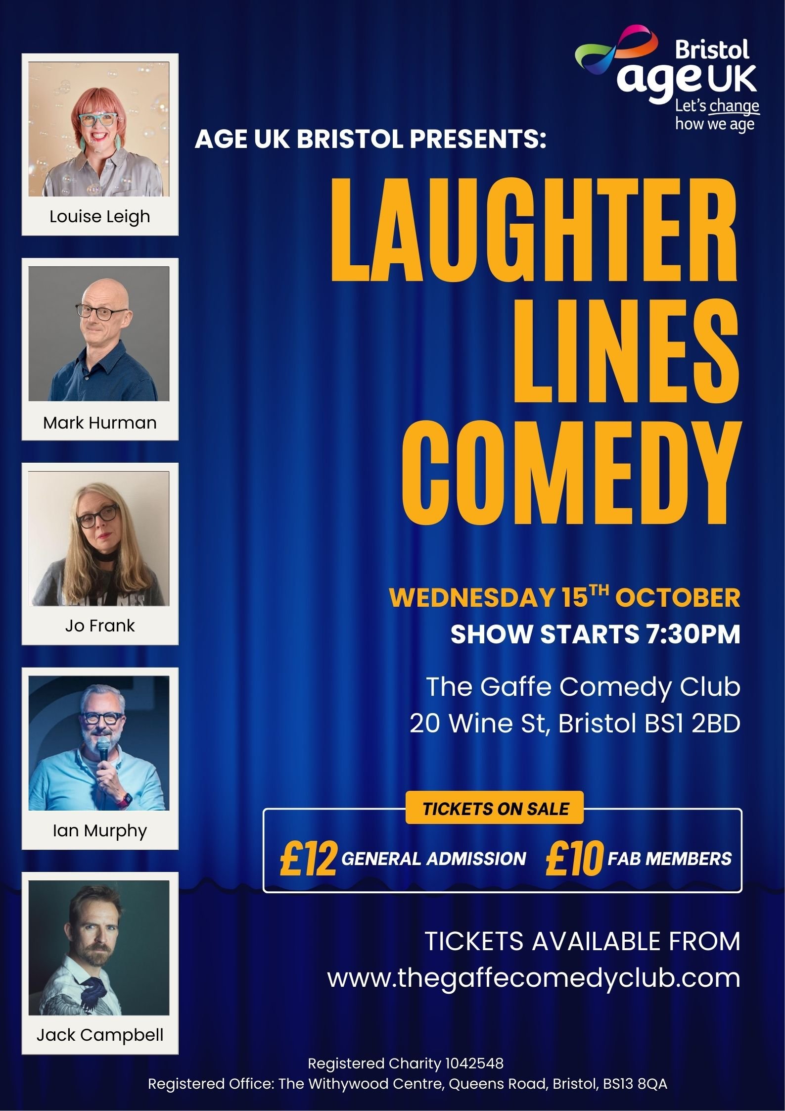 We are excited to let you know that we are running our very first comedy night - "Laughter Lines" on Wednesday 15th October at The Gaffe Comedy Club, Wine Street (opposite Castle Park). This is part of our fundraising for our 30th anniversary, tickets are just £12 and a reduced price for FAB members.
