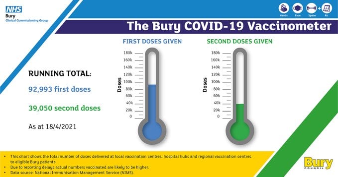 By 18th April 2021, a total of 92,993 first doses of the vaccine had been delivered by Bury’s four community vaccination centres, hospital hubs and regional vaccination centres. In addition, 39,050 Bury residents have received their second dose so it is likely that all you lovely readers are now well and truly vaccinated!