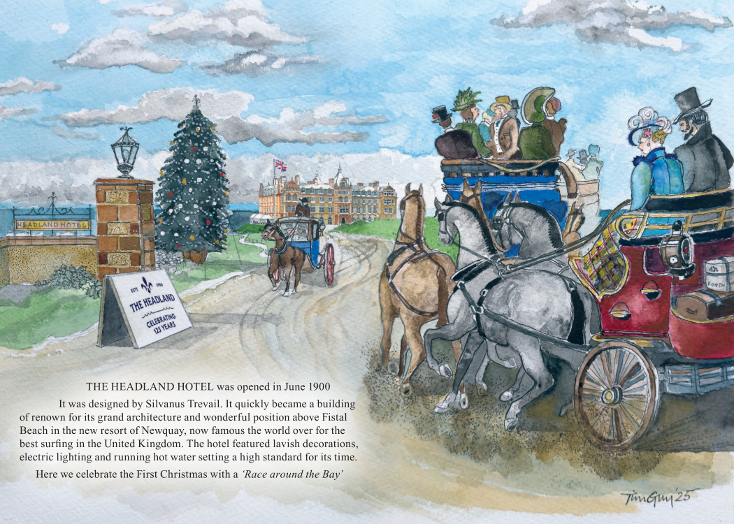 This year also marks the 125th anniversary of the Headland Hotel! To celebrate this milestone, Tim has designed a greeting card titled “First Christmas – A Race around the Bay,” featuring our logo on the back (see the front page below).