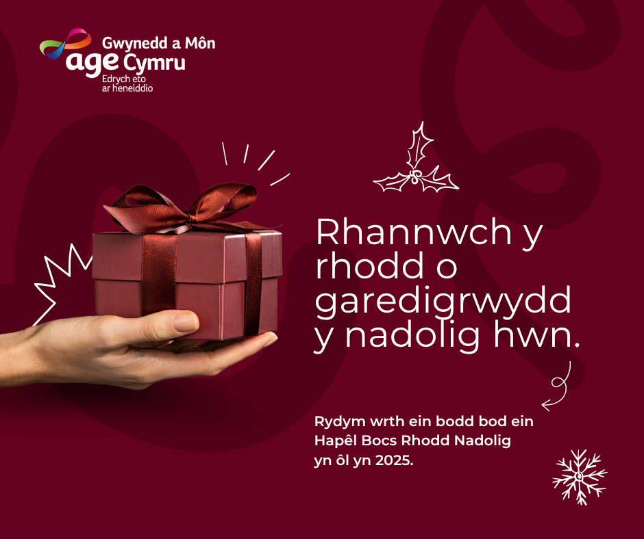 Rydyn ni’n casglu anrhegion i bobl hŷn sy’n teimlo’n unig dros yr ŵyl.