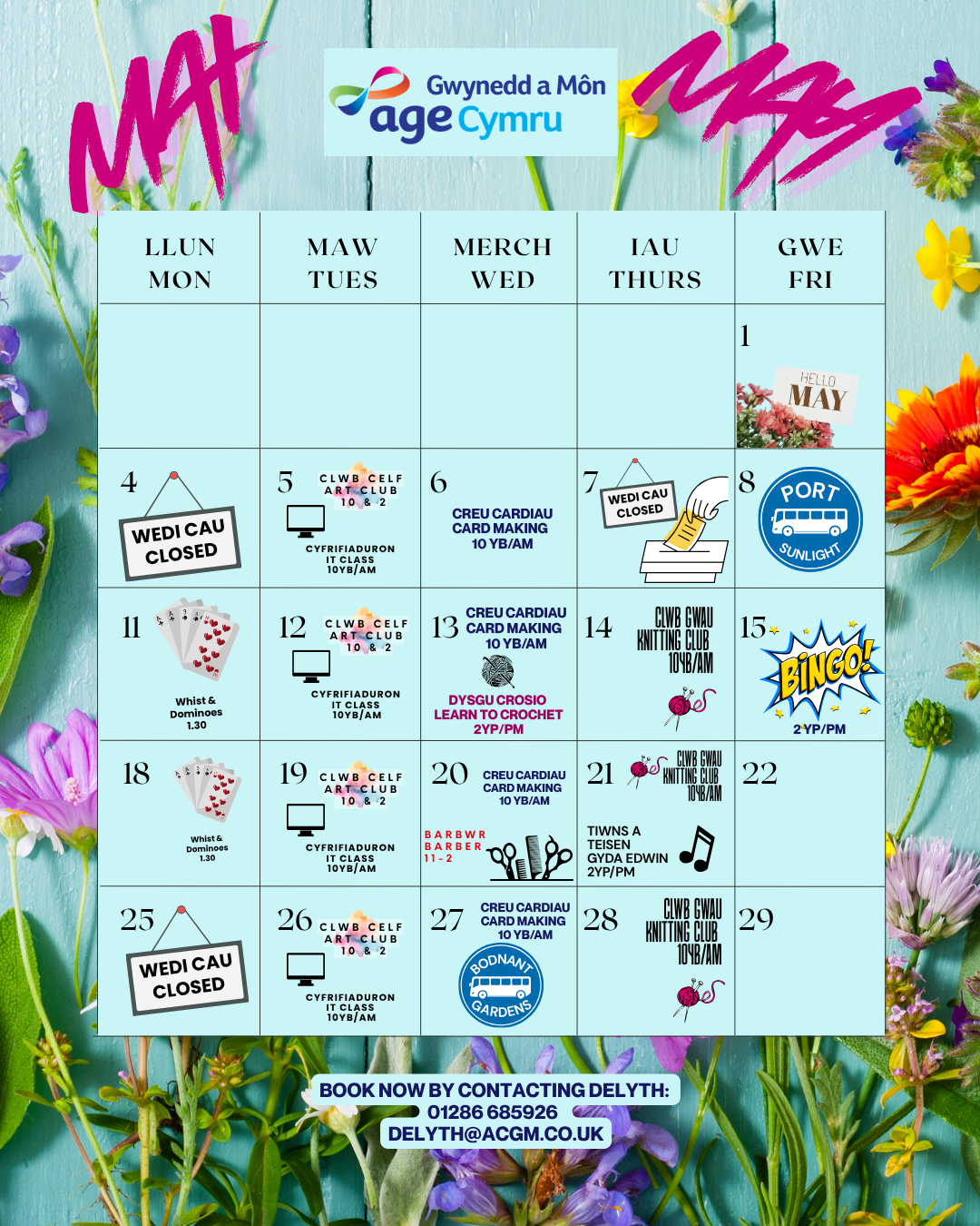 To book please call - 01286 685213 or e-mail at - delyth@acgm.co.uk