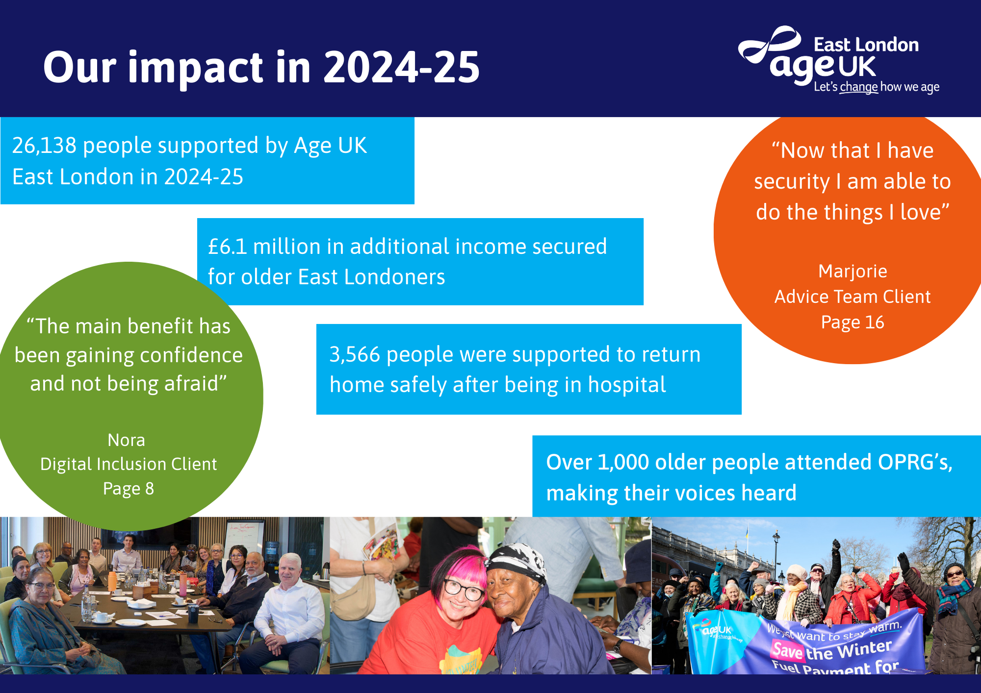 Last year we supported 26,138 older people and unpaid carers across Hackney, Tower Hamlets, and Newham. We are proud of the work we do at Age UK East London, making sure older East Londoners have opportunities to be heard, independent, connected and informed.