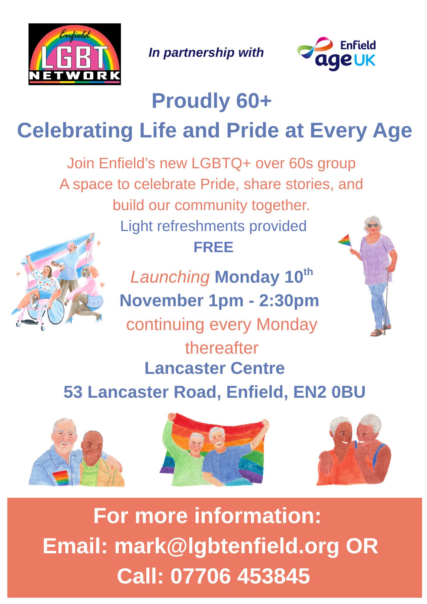 Enfield LGBT Network, in partnership with Age UK Enfield, is proud to announce the launch of a new community group for LGBTQ+ people aged 60 and over. The initiative celebrates life, pride, and connection at every age, offering a welcoming space to share stories, make friends, and build community together.