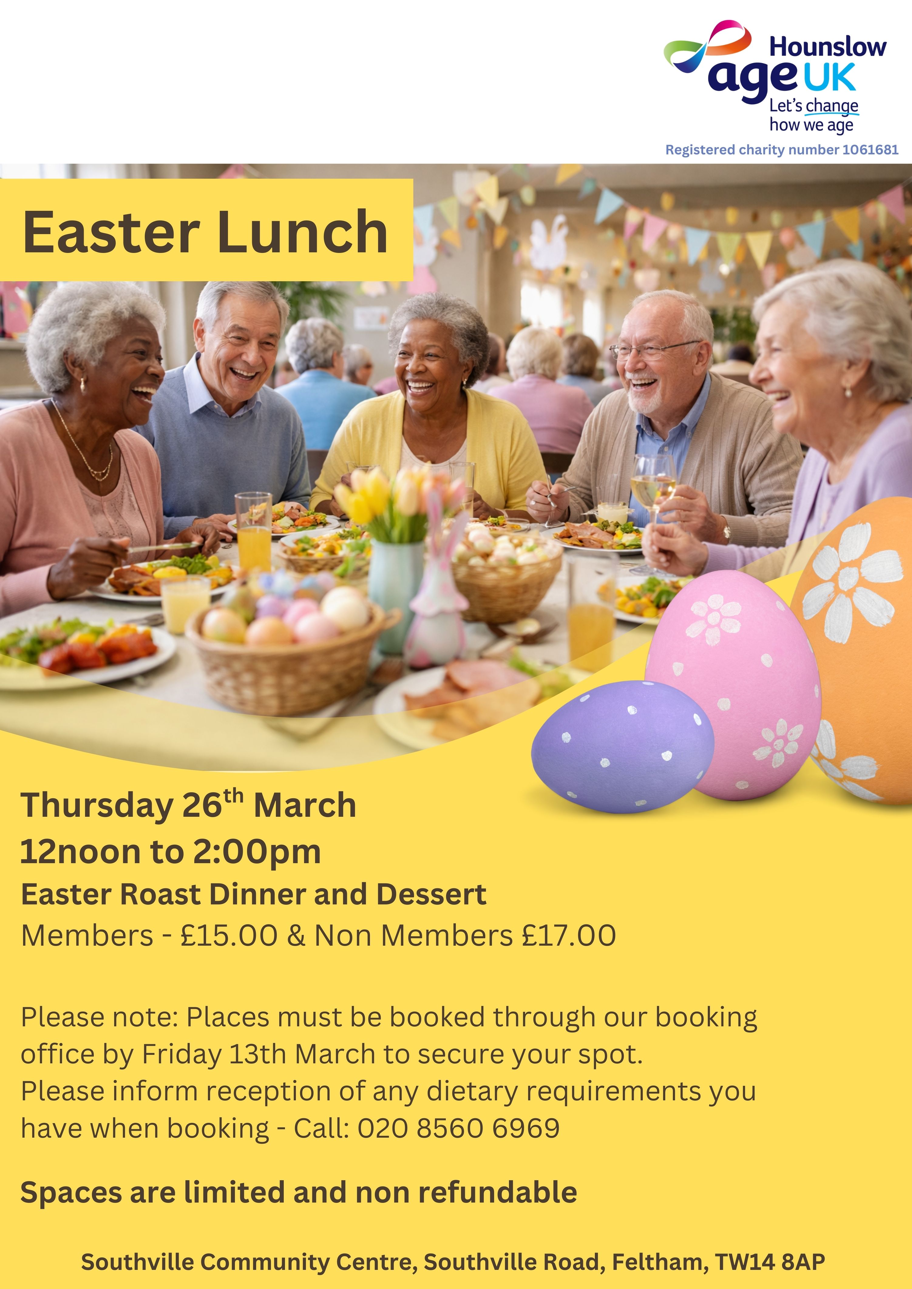 Age UK Hounslow will be hosting an Easter Lunch on Thursday 26th March 2026 at 12noon to 2:00pm