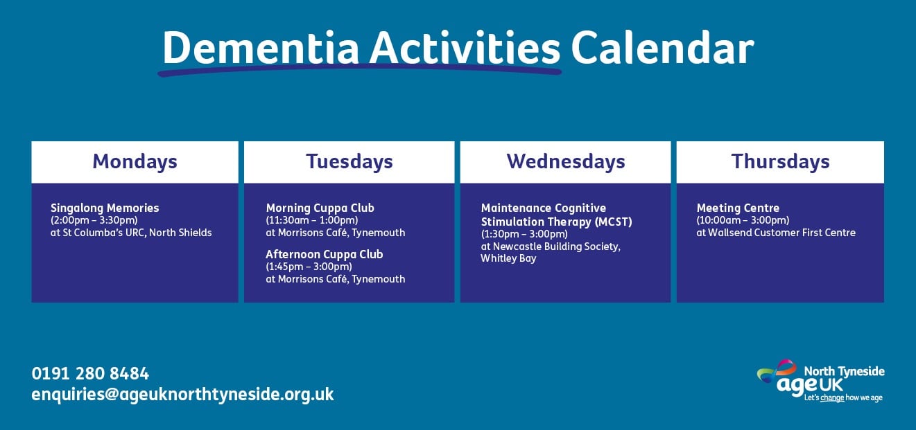 To find out more about our dementia activities, please call 0191 280 8484 or email enquiries@ageuknorthtyneside.org.uk.