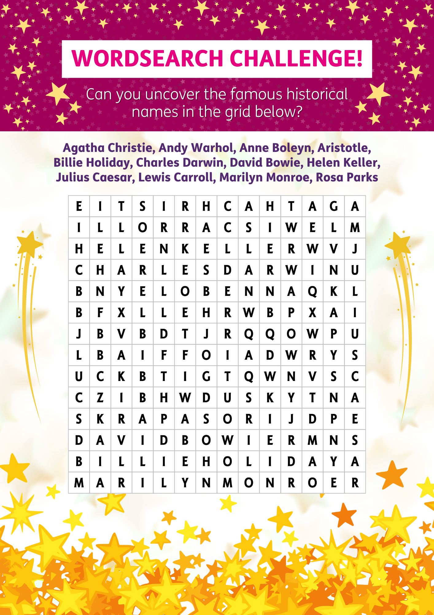We’re here on day 13 of our Winter Warmth advent calendar with a wordsearch activity for you to enjoy. Try and uncover the famous names in the grid, can you find them all?