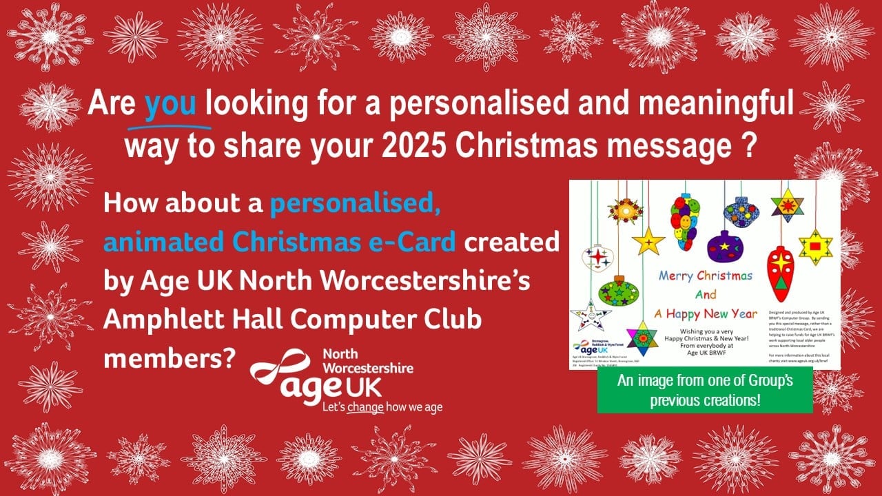 For several years, Age UK North Worcestershire's Computer Club members have been creating a special Christmas and Easter messages which they display at Amphlett Hall (Bromsgrove). In recent years, to help raise funds to support the charity's local work (providing support and services for people aged 50+ living in North Worcestershire), the members have been converting their designs to create animated e-Cards.