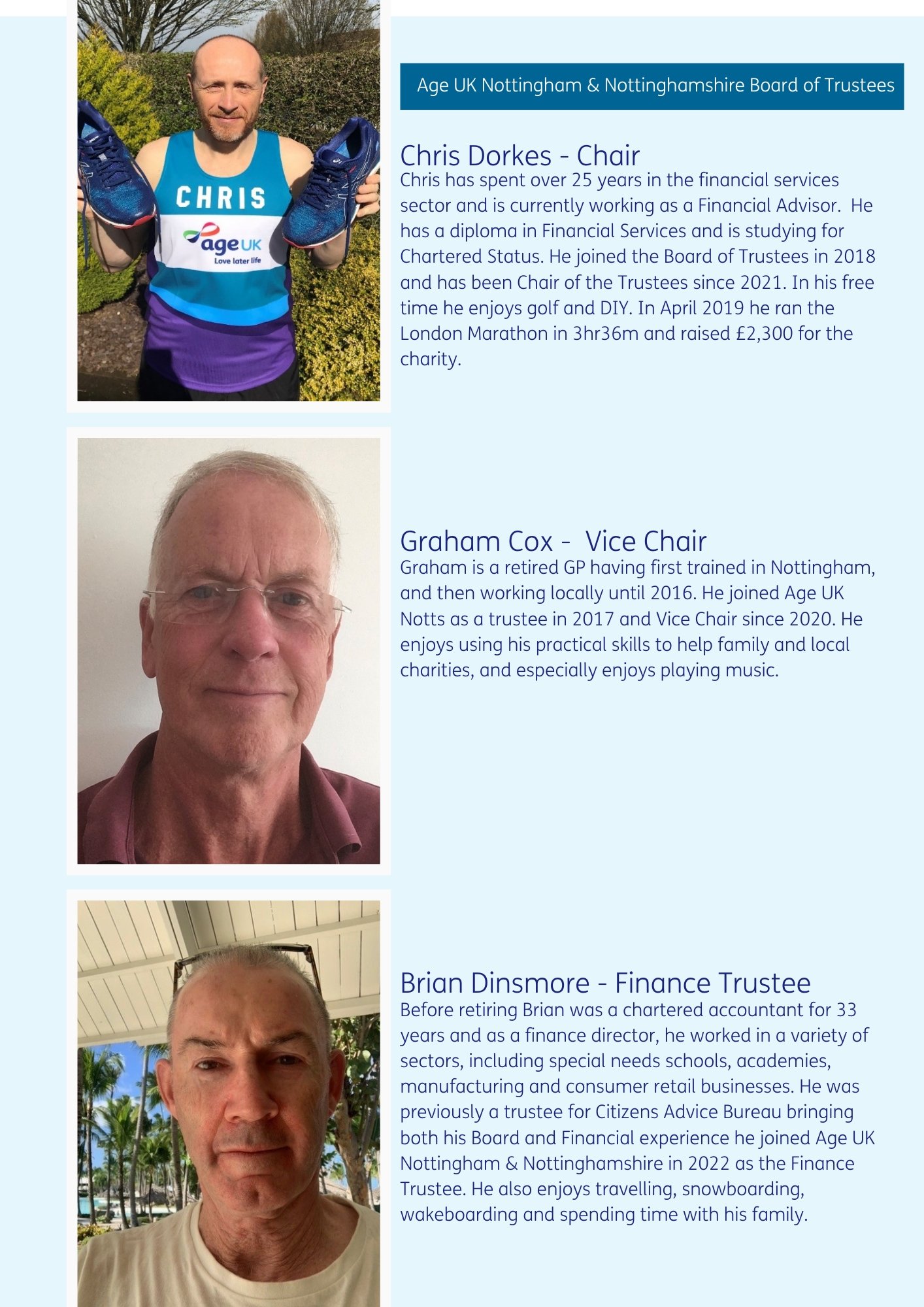 The Age UK Notts Community Advisory Panel acts as a consultation group and the ‘bridge’ between our charity and the wider community. They support the charity by raising issues from the community, reviewing our services and acting as ambassadors for the charity to ensure people can find the help they need as quickly as possible.