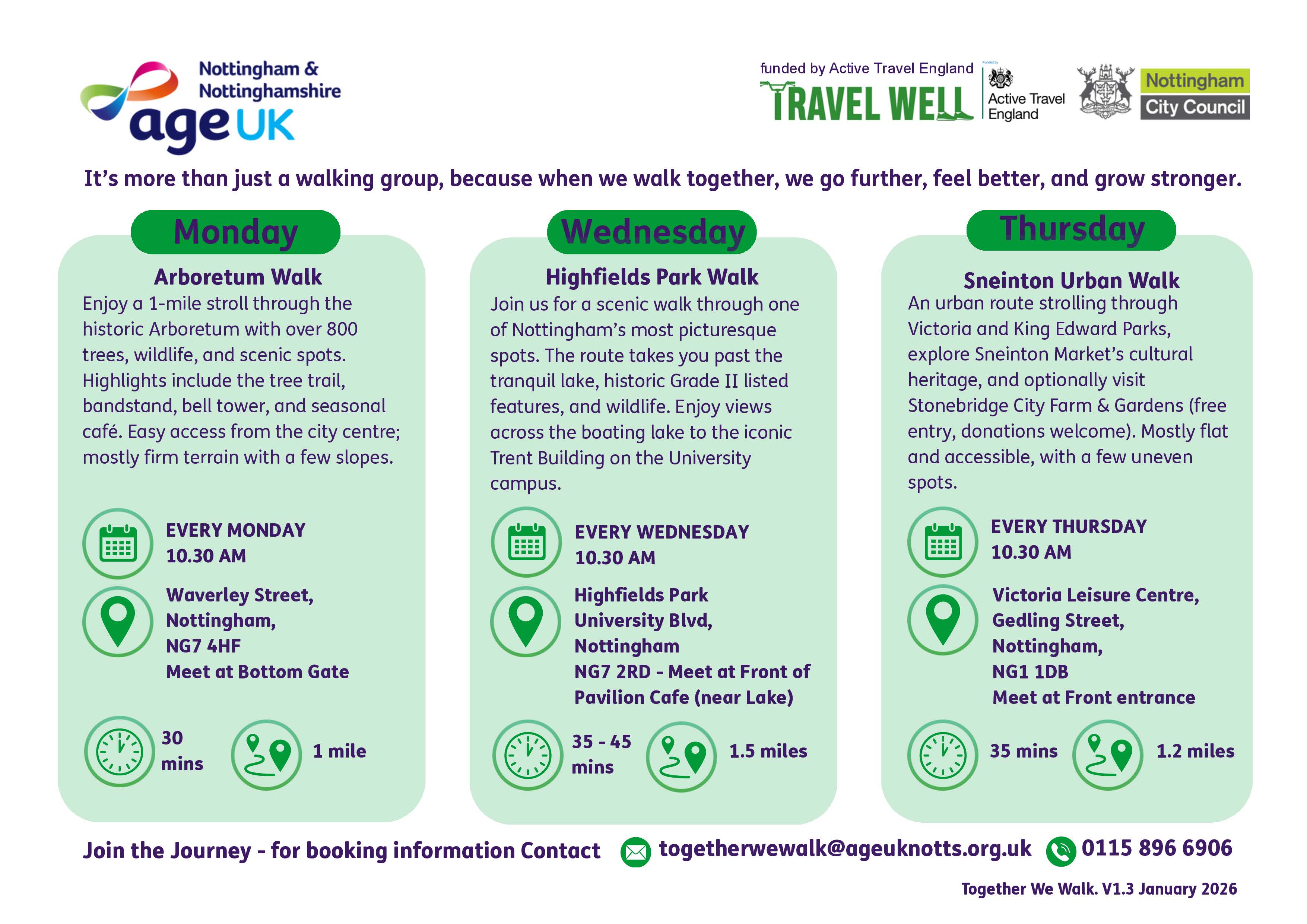To find out more, contact: Paul Goddard on 0115 896 6906 or email: togetherwewalk@ageuknotts.org.uk