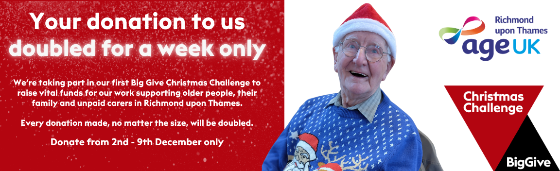 We are pleased to announce we are taking part for the first time in the Big Give Christmas Challenge. This December you can help Age UK Richmond raise vital funds to support older people and carers in the borough of Richmond upon Thames — helping them enhance their wellbeing, reduce loneliness and live independently and happily at home. Remember, Age UK Richmond is a local, independent charity dedicated exclusively to supporting older people and carers in the borough of Richmond upon Thames. When you donate to Age UK Richmond, every penny raised stays right here in Richmond upon Thames, supporting older people and their carers when they need us most.
