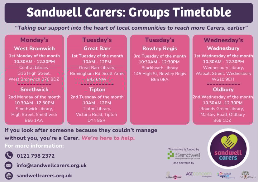We’re a partnership between Forward Carers, a not-for-profit organisation, and the regional charities; Age Concern Birmingham, St Albans Community Centre and Midland Mencap to deliver Sandwell Carers Service. Providing a wide range of free support to help you in your caring role.