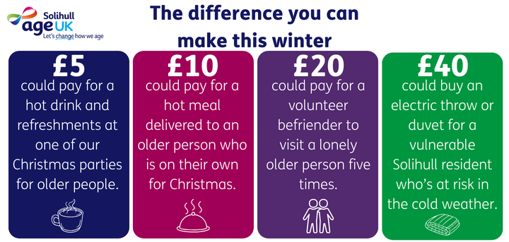 We need your help to enable us to continue to provide our vital services and support older people who need us this winter and beyond. Every action - whether a donation, a bake sale, or a friendship visit - helps ensure older people in Solihull feel remembered, supported, and connected.