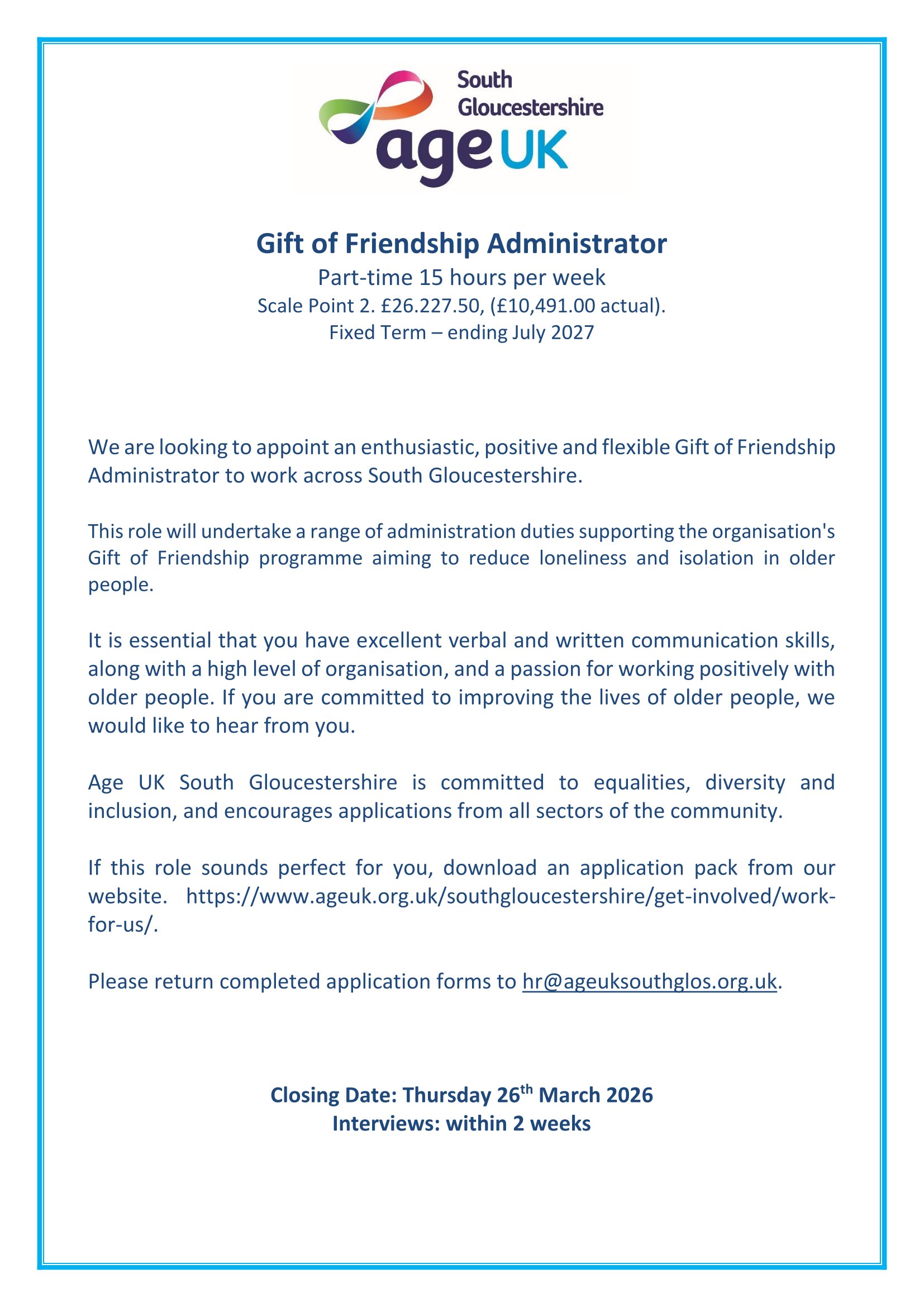 We are looking to recruit a Gift of Friendship Administrator.