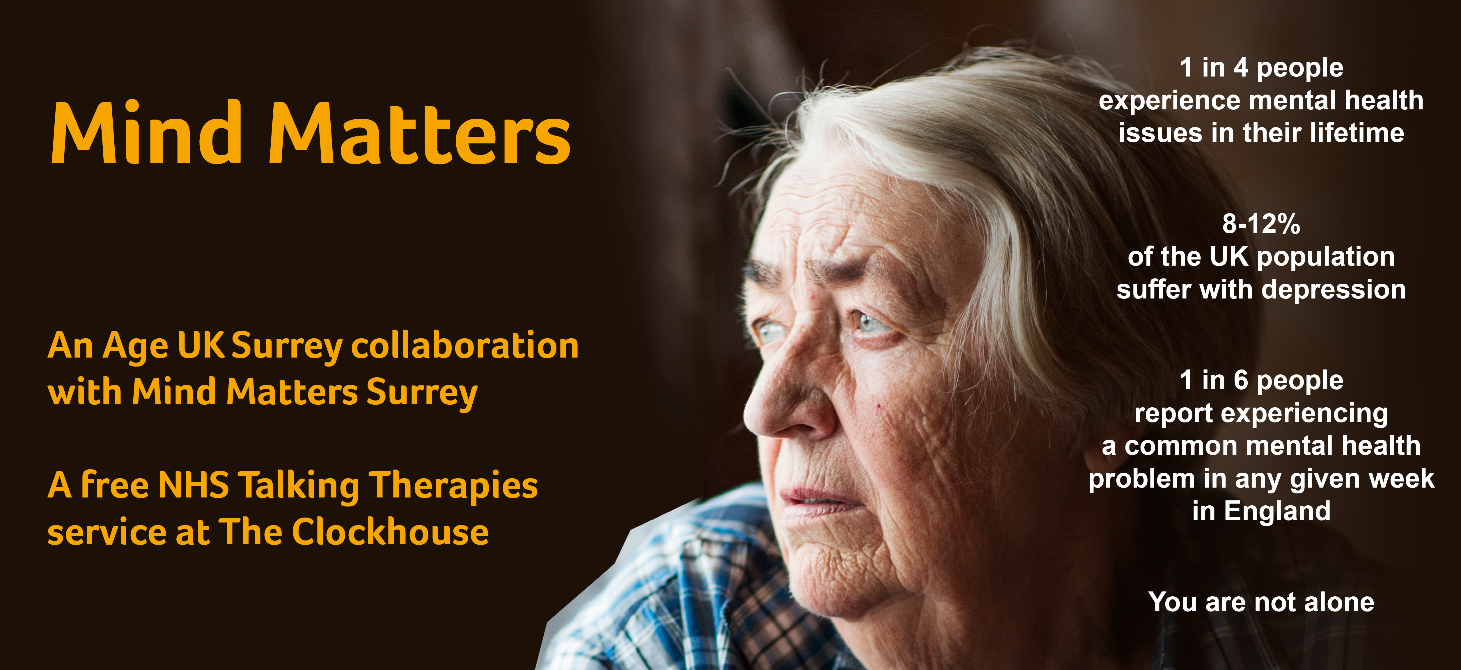 Catherine Hodgson, CEO of Age UK Surrey, said: ‘I am delighted that Age UK Surrey has partnered with Mind Matters Surrey to provide Talking Therapies at our Clockhouse Community Centre in Milford. We know that this important service will enable older people in our communities to access vital in-person support’.