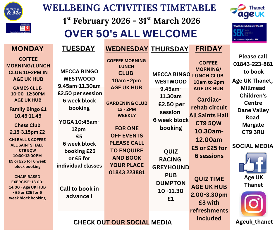 One off activities being held across the Thanet area, please contact info@ageukthanet.org.uk - 01843 223881 to enquire about the activities.
