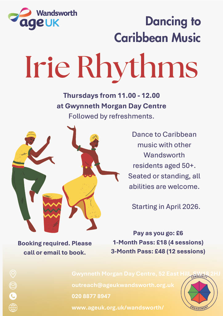 Dance to Caribbean music with other Wandsworth residents aged 50+. Seated or standing, all abilities are welcome.
