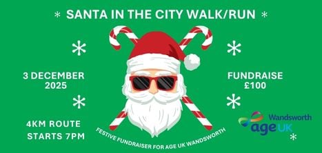 Have fun and fundraise for Age UK Wandsworth at Santa in the City 2025. The route is largely traffic-free and takes you past some of London’s most iconic landmarks, across majestic bridges, and along hidden paths on both sides of the river, all while dressed in a Santa Suit!