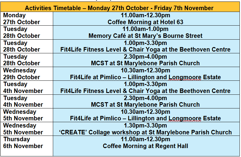 Newly launched Memory Café Supported by ‘Visiting Angels’ 28th October 11.00am-1.00pm - St Mary’s Church, Bourne Street, SW1W 8JJ