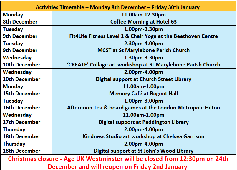 The forum/survey will help shape the development of a more holistic, person-centred service, ensuring it is informed by the voices of those who need it most. We will be looking to deliver the forum/survey in January. Please email enquiries@ageukwestminster.org.uk if you are interested in taking part.