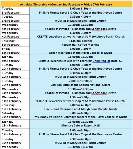 Our weekly Creative Dance & Movement sessions take place on Monday 2nd, 9th, 16th & 23rd February, 2.00pm – 3.30pm at Penfold Community Hub, 60 Penfold Street, NW8 8PJ. Gentle and playful movement class; chair based. For more information, please call Katie on