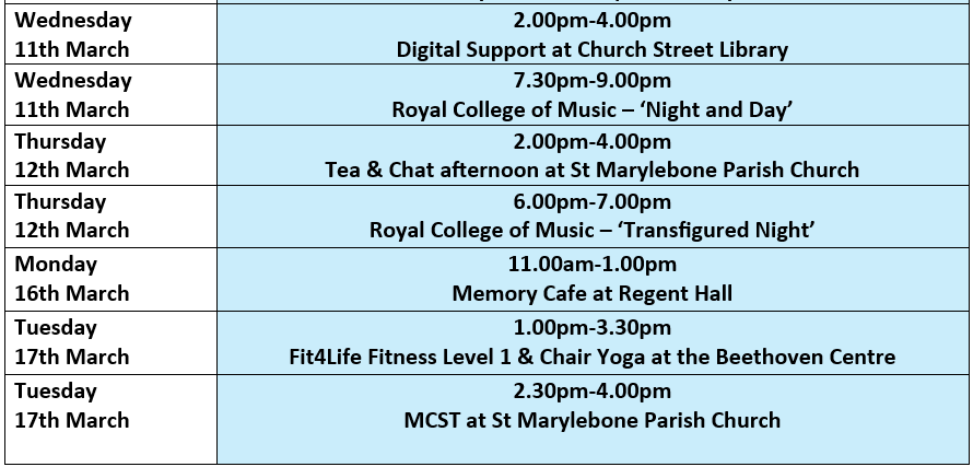 Monthly Tea and Chat afternoon, 2.00pm-4.00pm at St Marylebone Parish Church, 17 Marylebone Road, NW1 5LT.