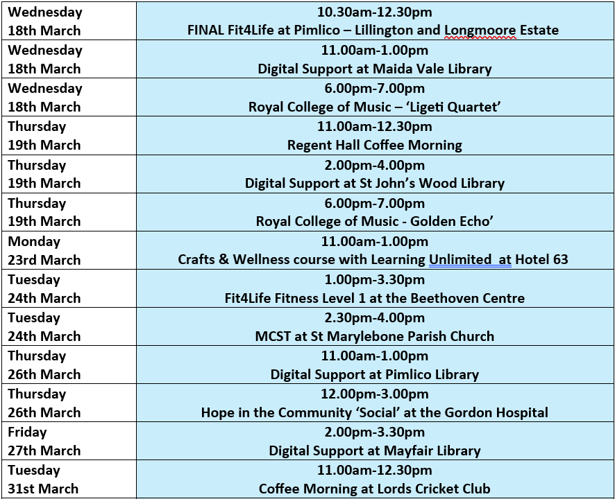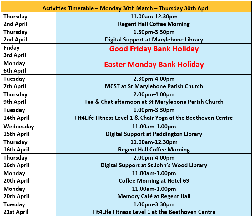 Heart of Westminster Memory Café Monday 11.00am-1.00pm – Takes place every 3rd Monday of the month at Regent Hall, Welcome Hub, 275 Oxford Street, W1C 2DJ, near Oxford Circus Tube Station.
