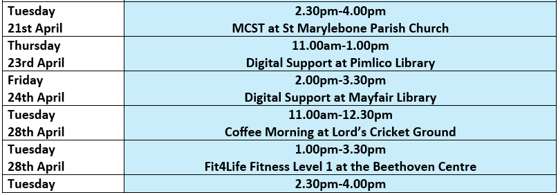 Tuesday 28th April 11.00am-12.30pm Coffee Morning at Lord’s Cricket Club, NW8 8QN